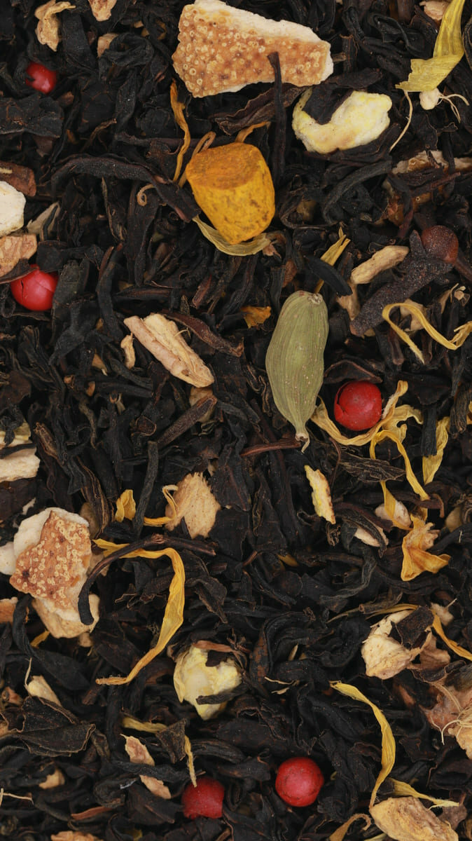 Thé noir d'Assam*, écorces d'orange*, arôme naturel de vanille, huile essentielle
